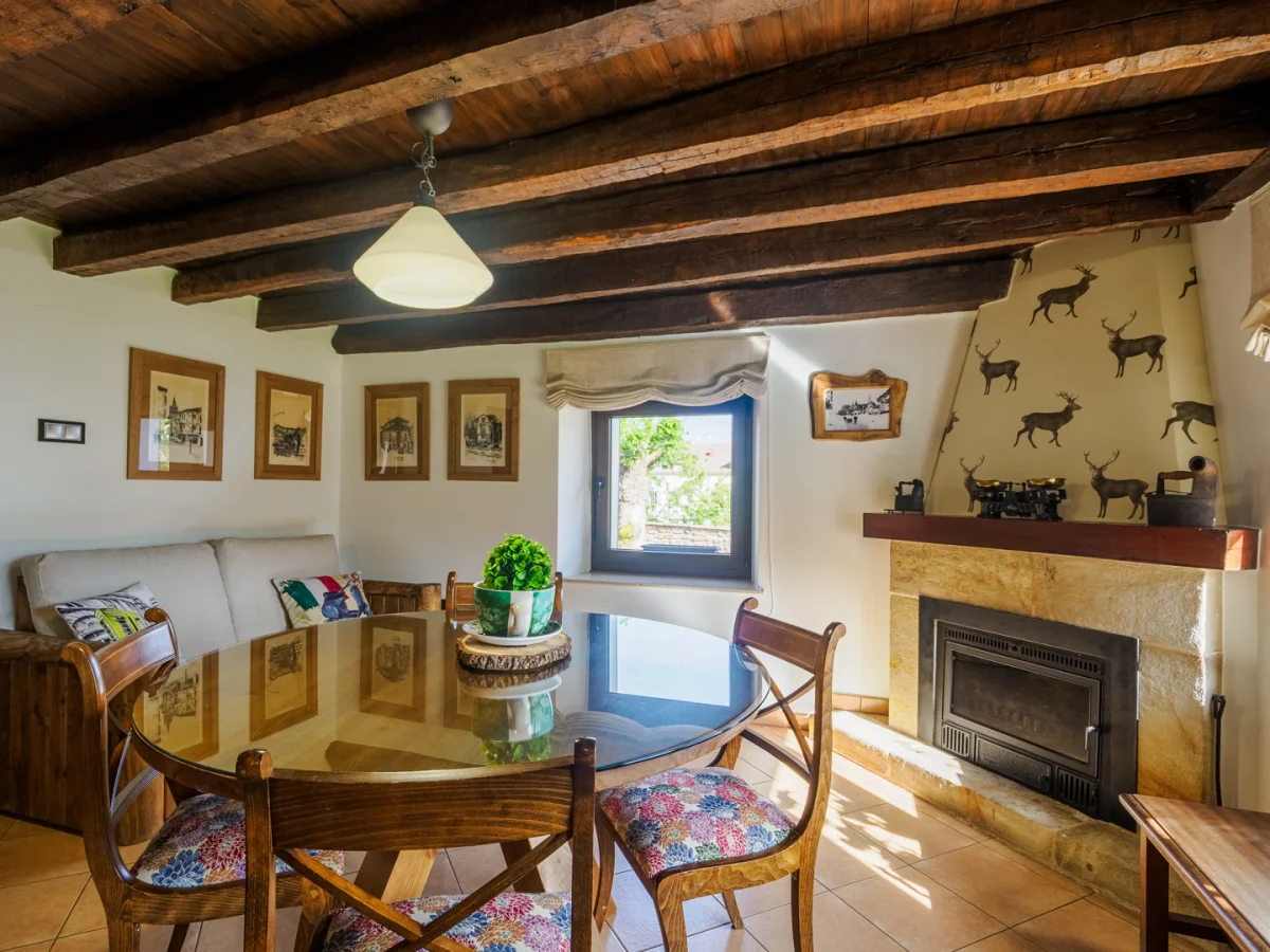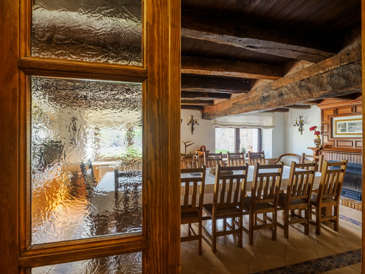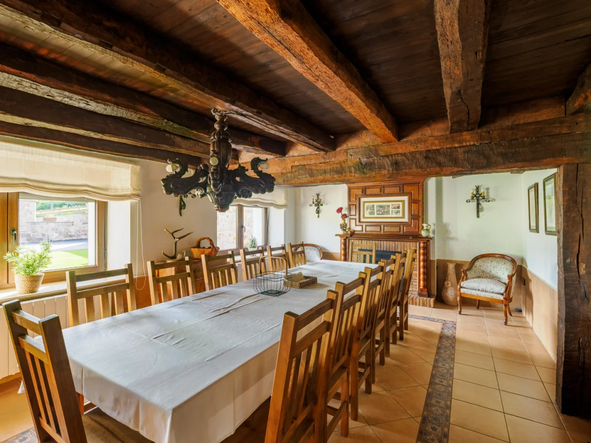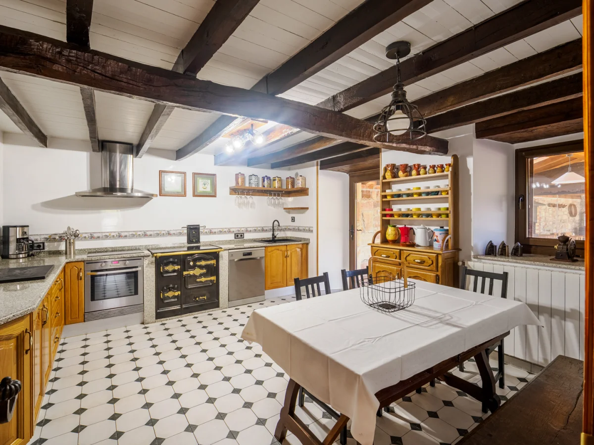 La casa está formada por una cocina típica de pueblo equipada al completo, una despensa, una salita con chimenea y televisión, un comedor con chimenea y una mesa para 20 comensales y dos baños completos en el primer piso.