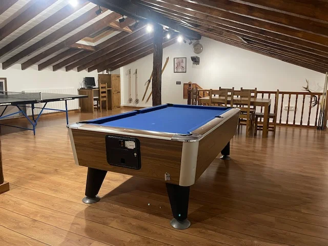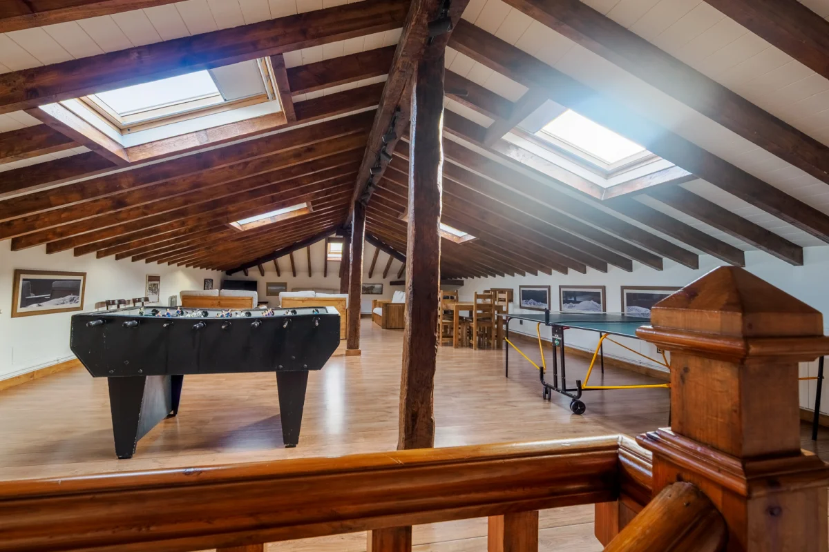 Y en el último piso tenemos un aguardillado diáfano de zona recreativa con mesa de Ping-pong, ordenador, televisión, juegos y mesas.