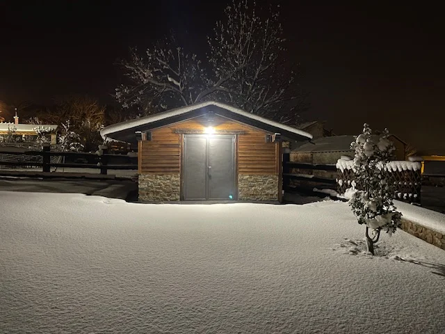 En el exterior consta de dos aparcamientos privados y una finca de 2000 metros cuadrados donde incorpora un campo de fútbol y una cancha de baloncesto.