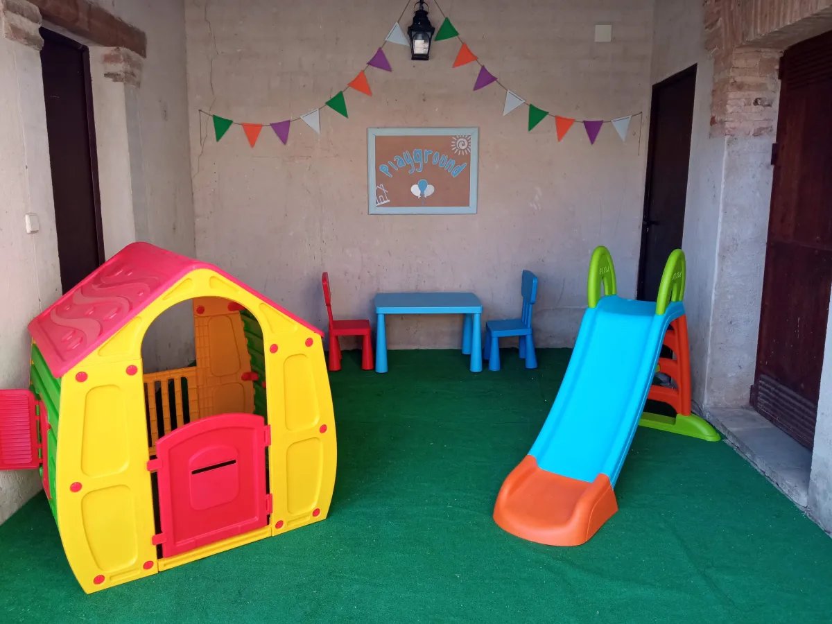 Por un lado, el patio principal dónde se encuentra el gran salón comedor, con cocina, zona de sofás y baños. Y además, una zona especial para niños en su interior y otra en el exterior.