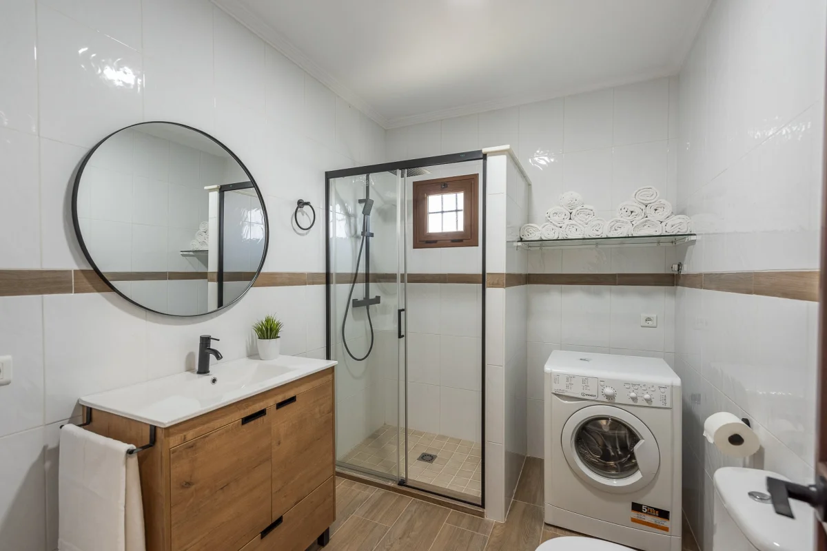Cocina abierta al salón con barra. Vitrocerámica 4 fuegos, horno, microondas, tostadora, frigoríficos, lavavajillas,…