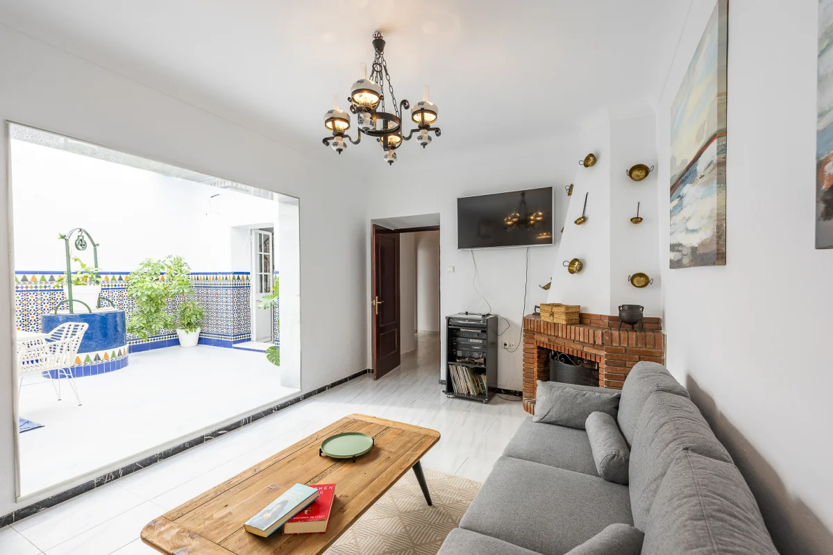Gran salón Comedor con Chimenea con TV plasma con canales IPTV. Aire acondicionado, Wifi,… con techo de montera acristalada.