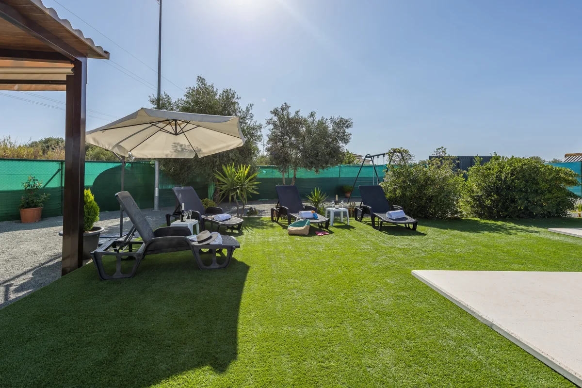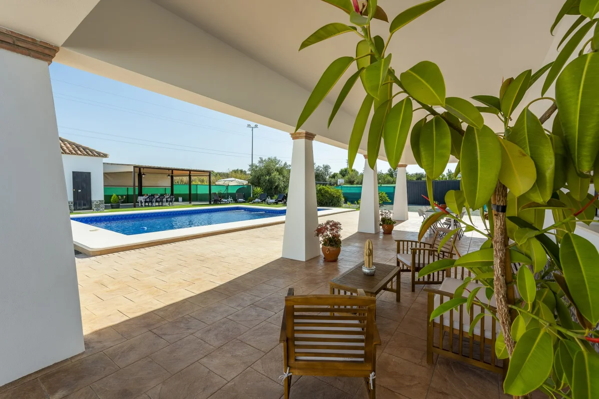 Porche de 48 m. mirando hacia la piscina. Barbacoa.