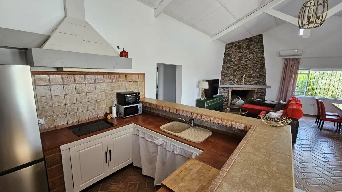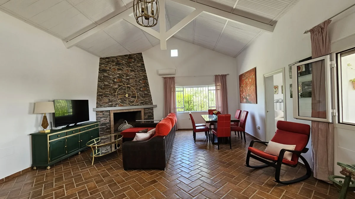 Gran salón comedor con techo a dos aguas de madera, aire acondicionado frío-calor, TV 55″ pantalla plana con canales IPTV, gran chimenea.
