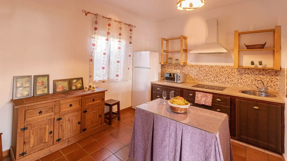 Cocina con vitrocerámica de 4 fuegos, horno, microondas, tostadora, cafetera, frigorífico,… dispone de despensa, plancha, lavadora,…