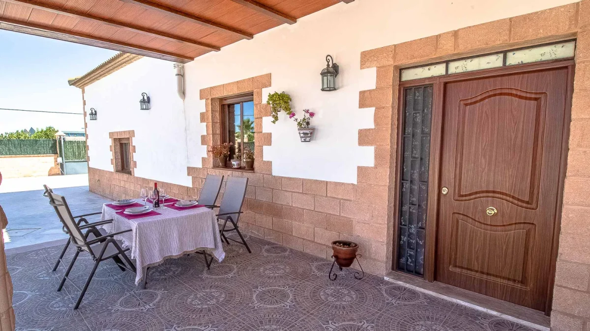 Amplio porche con cierre protector laterales, balancín y mesa exterior.