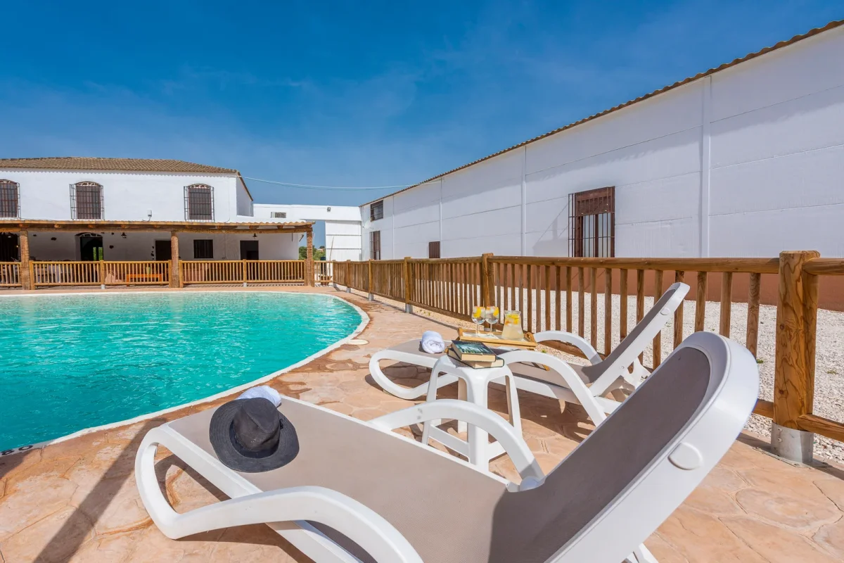 Casa San Miguel ideal para grandes grupos. Gran porche exterior con barbacoa y barra, con vistas a la gran piscina rústica.