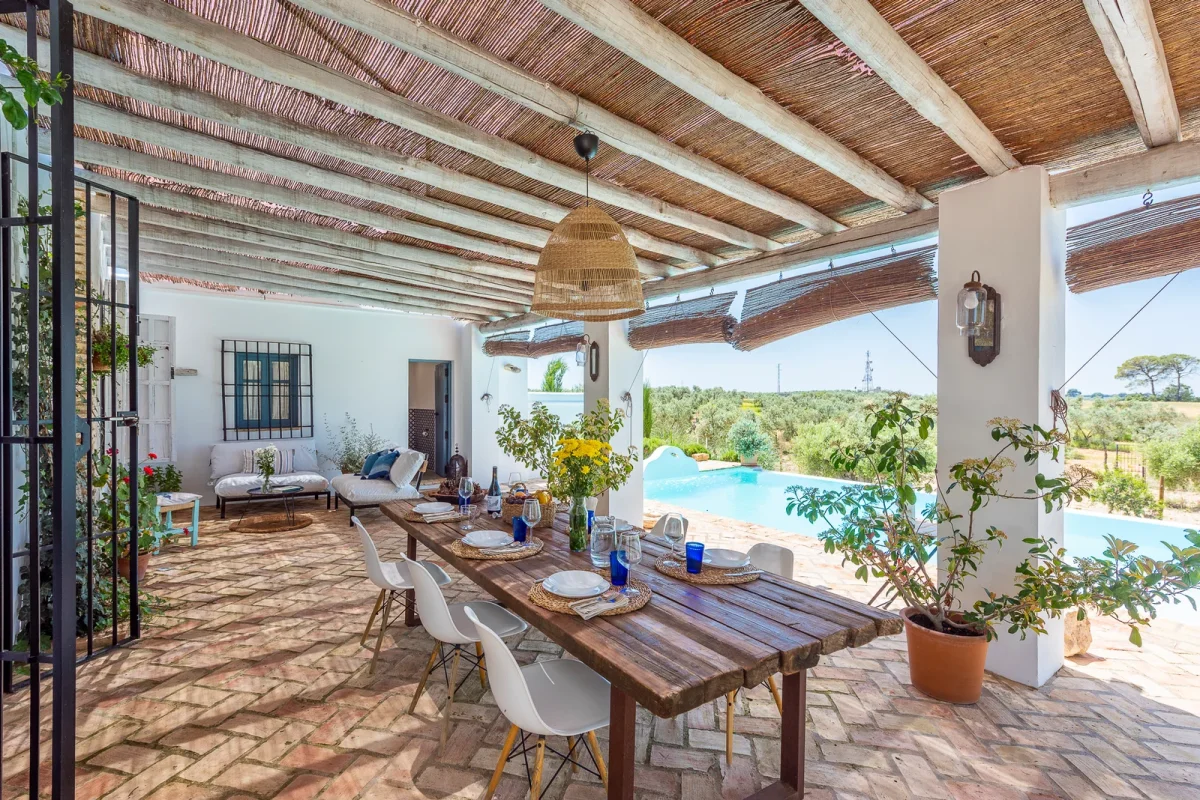 Porche zona piscina con mobiliario exterior y mesa junto piscina.