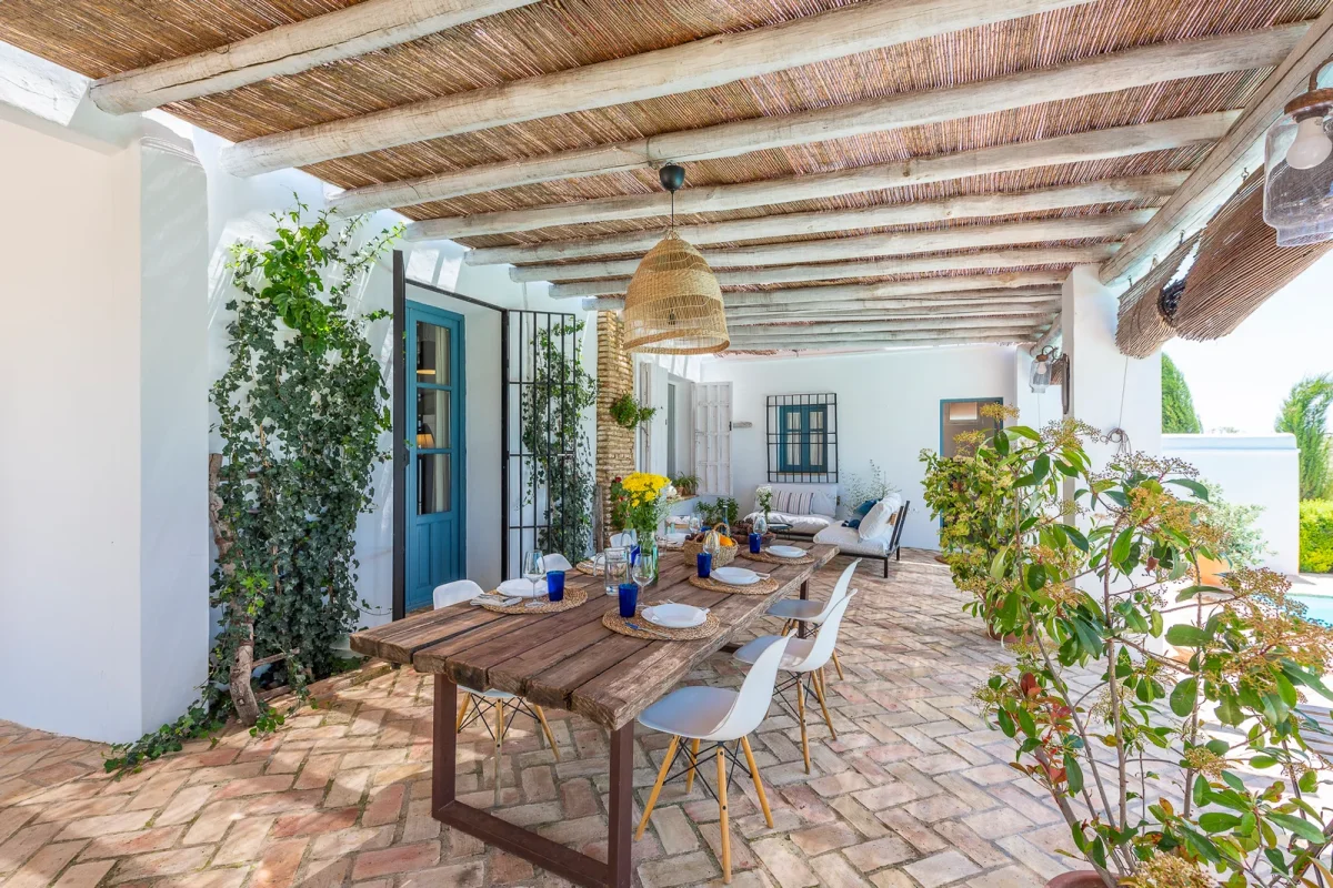 Porche entrada con mesa desayunos.