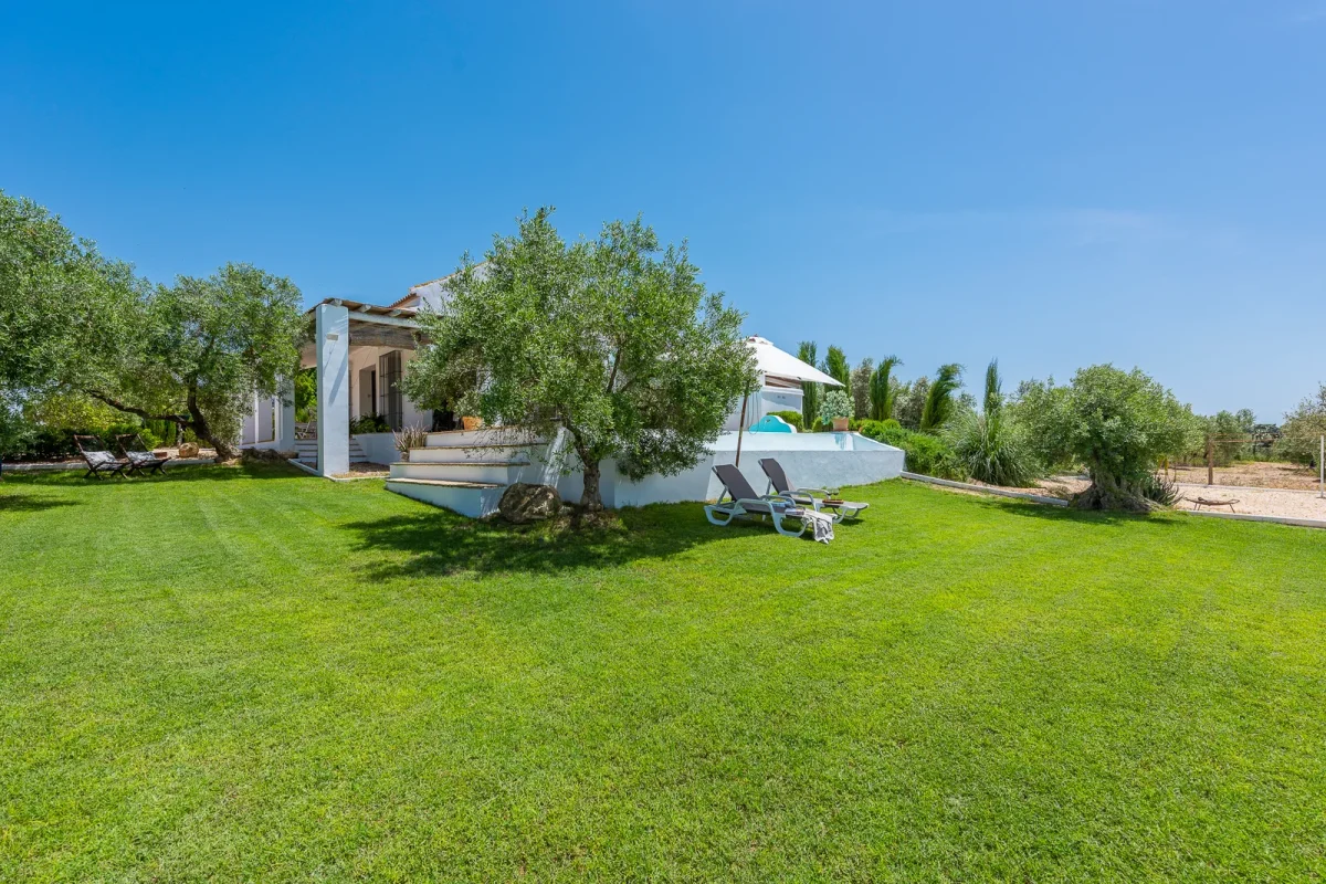 Zona césped con tumbonas.