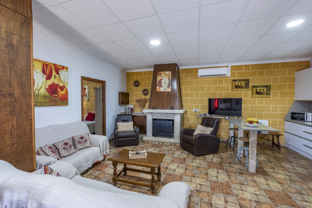 Gran Salón Comedor con Chimenea y cocina abierta con TV plasma con Satélite ASTRA. Aire acondicionado, Wifi.