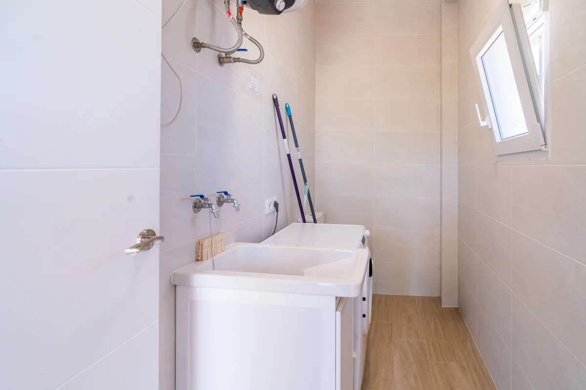 Cocina abierta al salón con vitrocerámica de 3 fuegos, horno, microondas, tostadora, cafetera, frigorífico, lavavajillas…