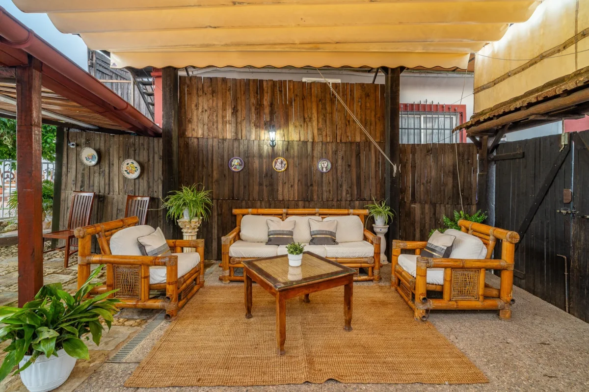 Porche techado con vistas hacia la piscina con valla protección niños.