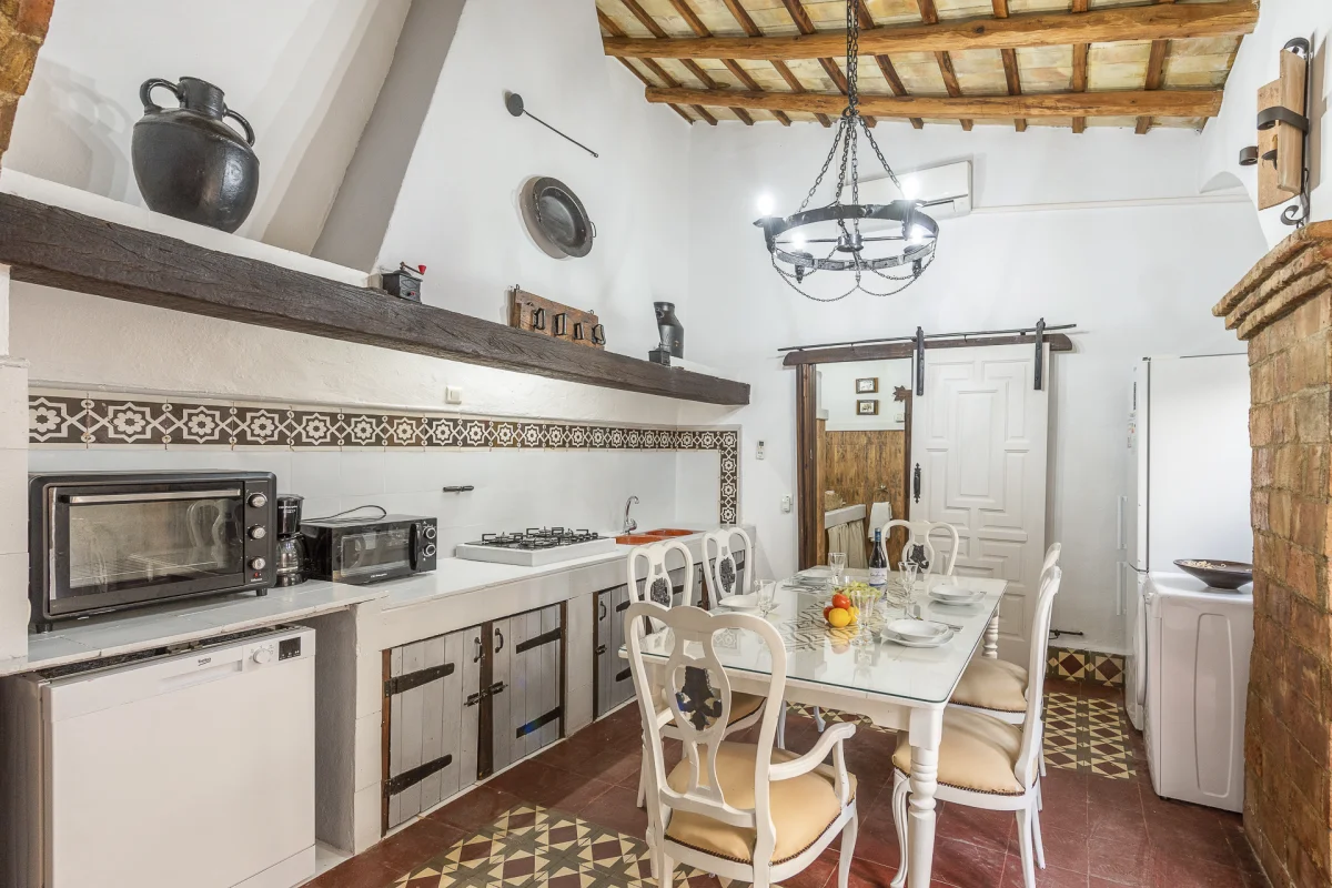 Cocina independiente completa con 4 fuegos a gas, microondas, horno, frigorífico, lavadora, lavavajillas,.… salida al patio desayunos.