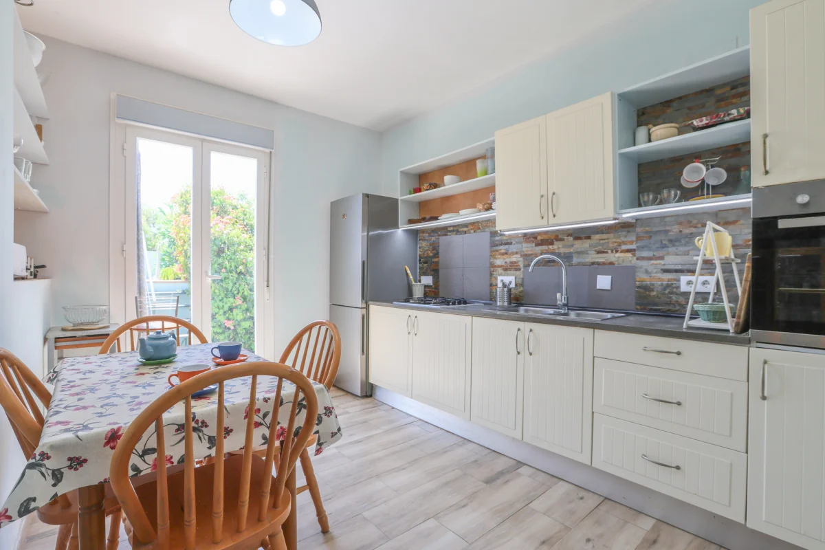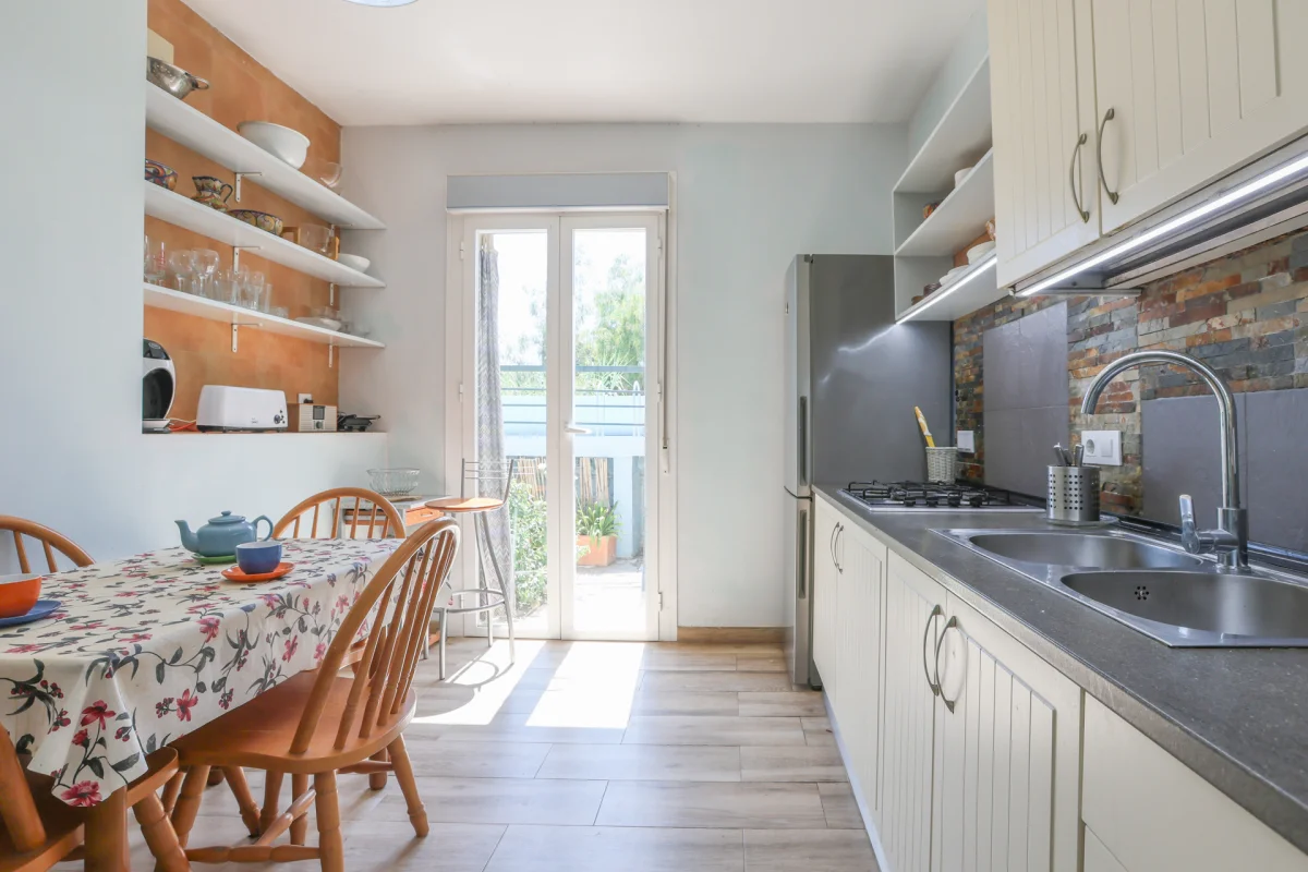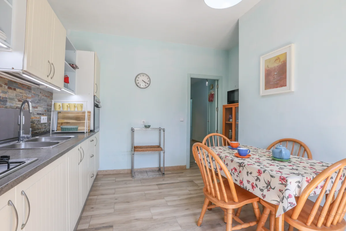 Cocina independiente totalmente equipada con salida a zona piscina, 4 fuegos a gas, horno, micro-ondas, cafetera, frigorífico,…