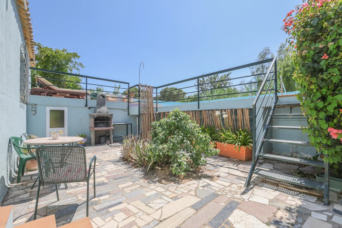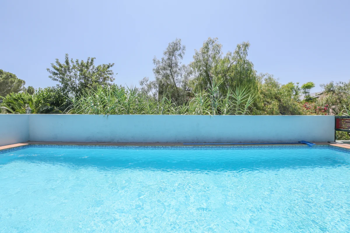 La piscina se encuentra en una zona elevada al jardín con acceso a través de escalera.