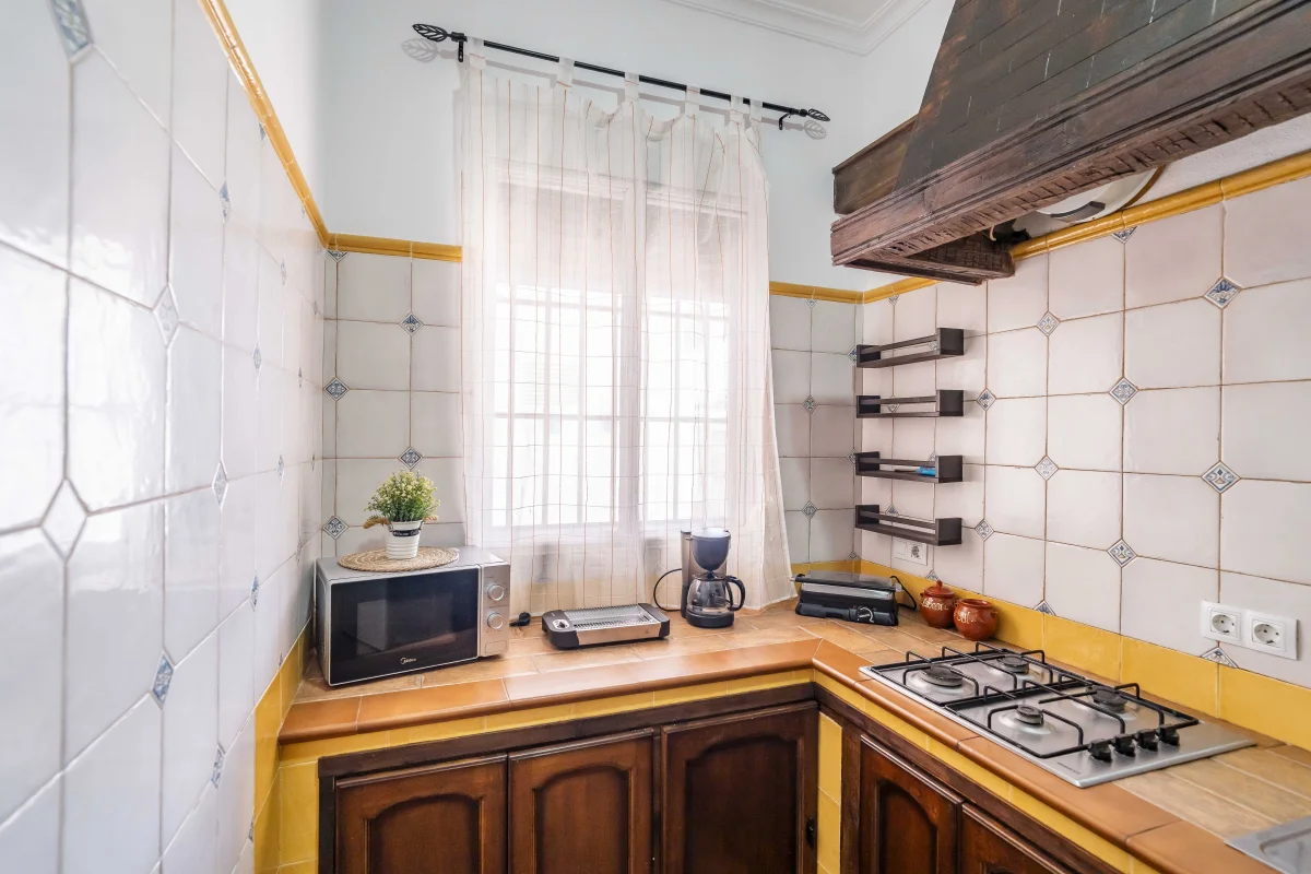 Cocina independiente que dispone de cocina 4 fuegos, microondas, cafetera, tostadora, frigorífico,…